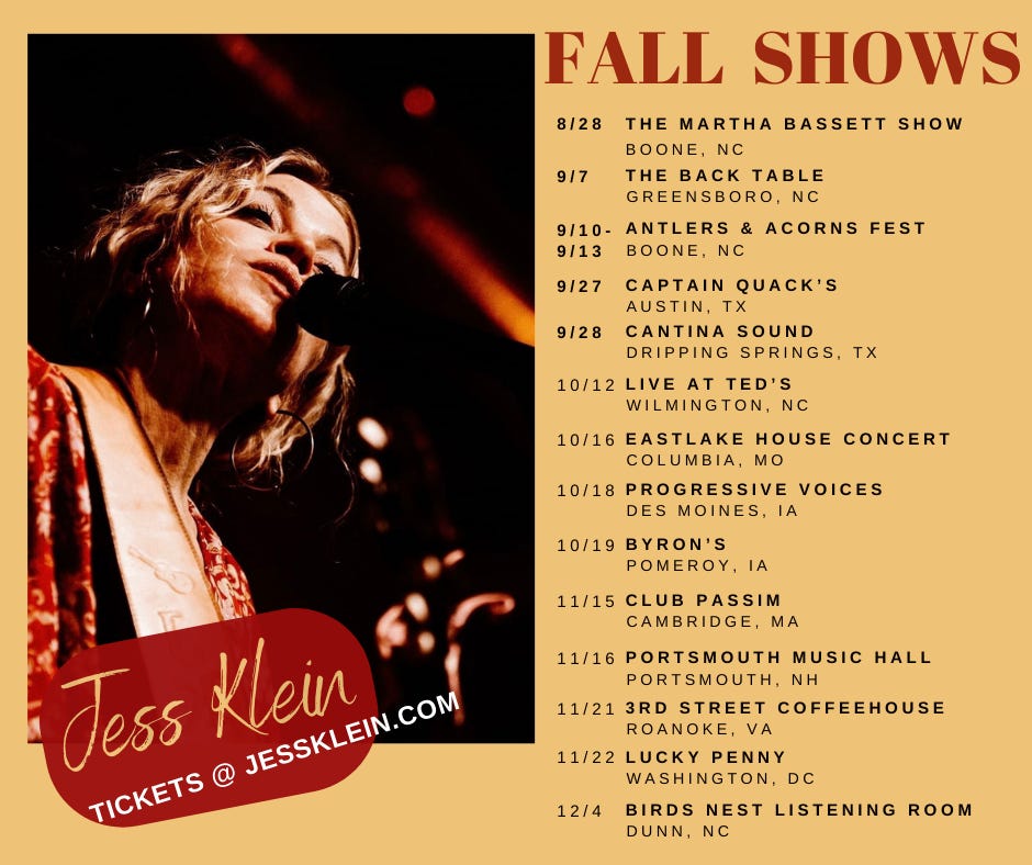 Whole slew of fun shows coming up. I’m pulling out some brand new tunes as I’ll be recording the new album come September! Get tickets for all shows at JessKlein.com